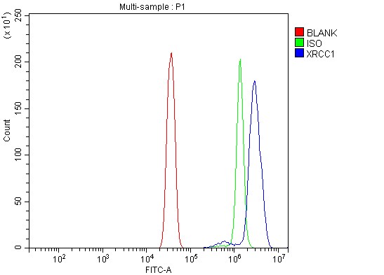 Overlay histogram showing Hela cells stained with M00571-2 (Blue line). To facilitate intracellular staining, cells were fixed with 4% paraformaldehyde and permeabilized with permeabilization buffer. The cells were blocked with 10% normal goat serum. And then incubated with mouse anti-XRCC1 Antibody (M00571-2) at 1:100 dilution for 30 min at 20°C. Fluoro488 conjugated goat anti-mouse IgG (BA1126) was used as secondary antibody at 1:100 dilution for 30 minutes at 20°C. Isotype control antibody (Green line) was mouse IgG at 1:100 dilution used under the same conditions. Unlabelled sample without incubation with primary antibody and secondary antibody (Red line) was used as a blank control.