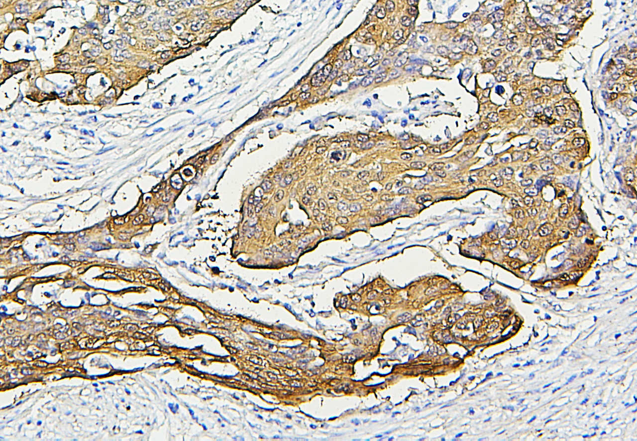 HSP27/HSPB1 was detected in a paraffin-embedded section of human oesophagus squama cancer tissue. Biotinylated goat anti-mouse IgG was used as secondary antibody. The tissue section was incubated with mouse anti-HSP27/HSPB1 Antibody (M00676-5) at a dilution of 1:200 and developed using Strepavidin-Biotin-Complex (SABC) (Catalog # SA1021) with DAB (Catalog # AR1027) as the chromogen.