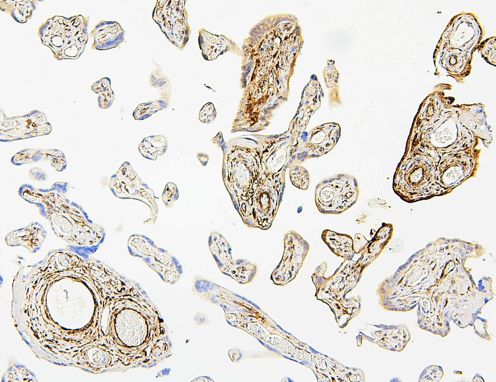 HSP27/HSPB1 was detected in a paraffin-embedded section of human placenta tissue. Biotinylated goat anti-mouse IgG was used as secondary antibody. The tissue section was incubated with mouse anti-HSP27/HSPB1 Antibody (M00676-5) at a dilution of 1:200 and developed using Strepavidin-Biotin-Complex (SABC) (Catalog # SA1021) with DAB (Catalog # AR1027) as the chromogen.