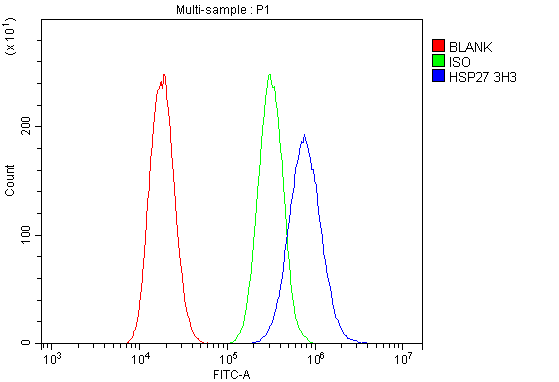 Overlay histogram showing A549 cells stained with M00676-5 (Blue line). To facilitate intracellular staining, cells were fixed with 4% paraformaldehyde and permeabilized with permeabilization buffer. The cells were blocked with 10% normal goat serum. And then incubated with mouse anti-HSP27/HSPB1 Antibody (M00676-5) at 1:100 dilution for 30 min at 20°C. Fluoro488 conjugated goat anti-mouse IgG (BA1126) was used as secondary antibody at 1:100 dilution for 30 minutes at 20°C. Isotype control antibody (Green line) was mouse IgG at 1:100 dilution used under the same conditions. Unlabelled sample without incubation with primary antibody and secondary antibody (Red line) was used as a blank control.