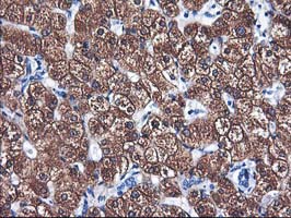 Immunohistochemical staining of paraffin-embedded Human liver tissue within the normal limits using anti-CYP2A6 mouse monoclonal antibody. (Heat-induced epitope retrieval by 10mM citric buffer, pH6.0, 100°C for 10min, M00947-2)
