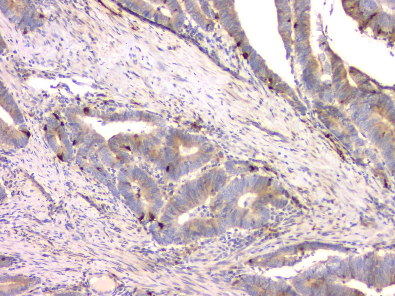 Cystatin C/CST3 was detected in a paraffin-embedded section of human colon cancer tissue. Biotinylated goat anti-mouse IgG was used as secondary antibody. The tissue section was incubated with mouse anti-Cystatin C/CST3 Antibody (M00961-1) at a dilution of 1:200 and developed using Strepavidin-Biotin-Complex (SABC) (Catalog # SA1021) with DAB (Catalog # AR1027) as the chromogen.