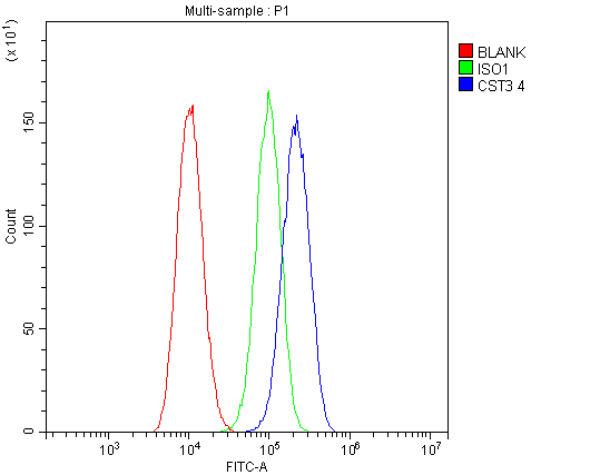 Overlay histogram showing A549 cells stained with M00961-1 (Blue line). To facilitate intracellular staining, cells were fixed with 4% paraformaldehyde and permeabilized with permeabilization buffer. The cells were blocked with 10% normal goat serum. And then incubated with mouse anti-Cystatin C/CST3 Antibody (M00961-1) at 1:100 dilution for 30 min at 20°C. Fluoro488 conjugated goat anti-mouse IgG (BA1126) was used as secondary antibody at 1:100 dilution for 30 minutes at 20°C. Isotype control antibody (Green line) was mouse IgG at 1:100 dilution used under the same conditions. Unlabelled sample without incubation with primary antibody and secondary antibody (Red line) was used as a blank control.