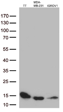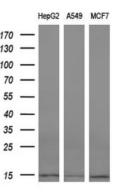 Western blot analysis of extracts (35ug) from 3 different cell lines by using anti-CST3 monoclonal antibody (1:500).
