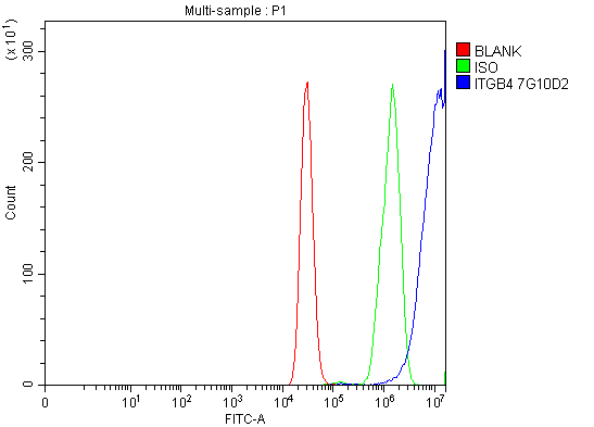 Overlay histogram showing MCF-7 cells stained with M01015-2 (Blue line). To facilitate intracellular staining, cells were fixed with 4% paraformaldehyde and permeabilized with permeabilization buffer. The cells were blocked with 10% normal goat serum. And then incubated with mouse anti-Integrin Beta 4/ITGB4 Antibody (M01015-2) at 1:100 dilution for 30 min at 20°C. Fluoro488 conjugated goat anti-mouse IgG (BA1126) was used as secondary antibody at 1:100 dilution for 30 minutes at 20°C. Isotype control antibody (Green line) was mouse IgG at 1:100 dilution used under the same conditions. Unlabelled sample without incubation with primary antibody and secondary antibody (Red line) was used as a blank control.