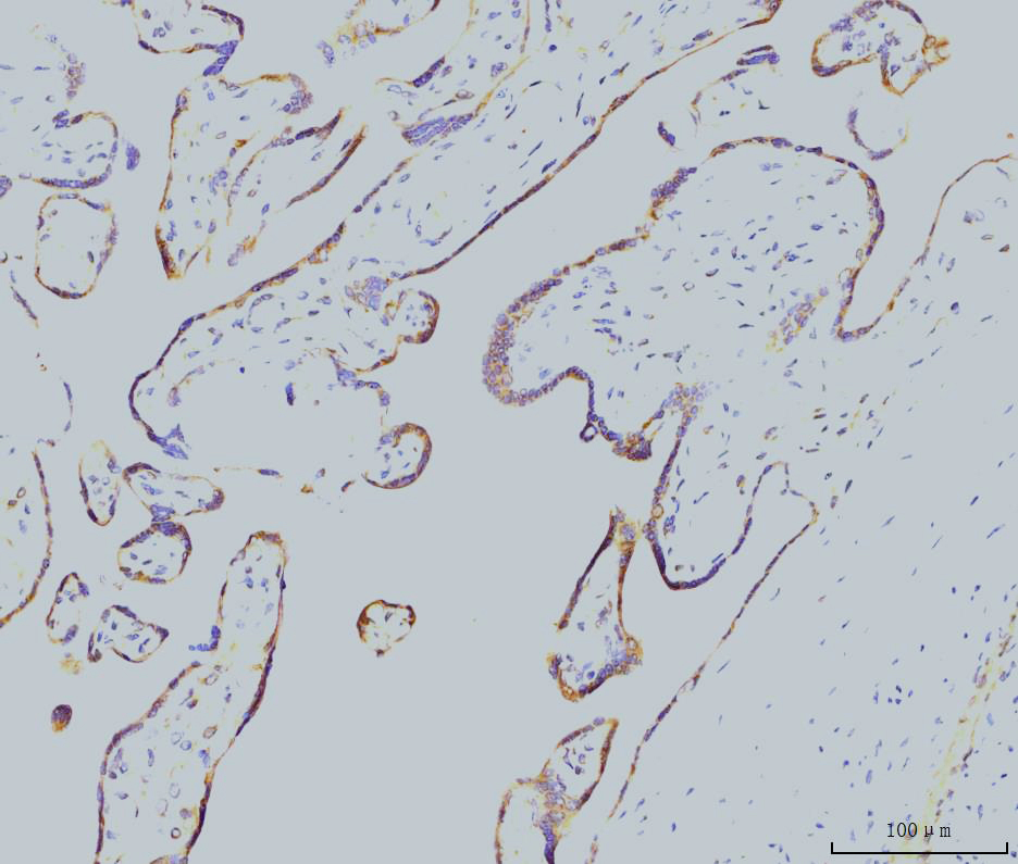 RAB11A was detected in a paraffin-embedded section of human placenta tissue. Biotinylated goat anti-mouse IgG was used as secondary antibody. The tissue section was incubated with mouse anti-RAB11A Antibody (M01436-2) at a dilution of 1:200 and developed using Strepavidin-Biotin-Complex (SABC) (Catalog # SA1021) with DAB (Catalog # AR1027) as the chromogen.