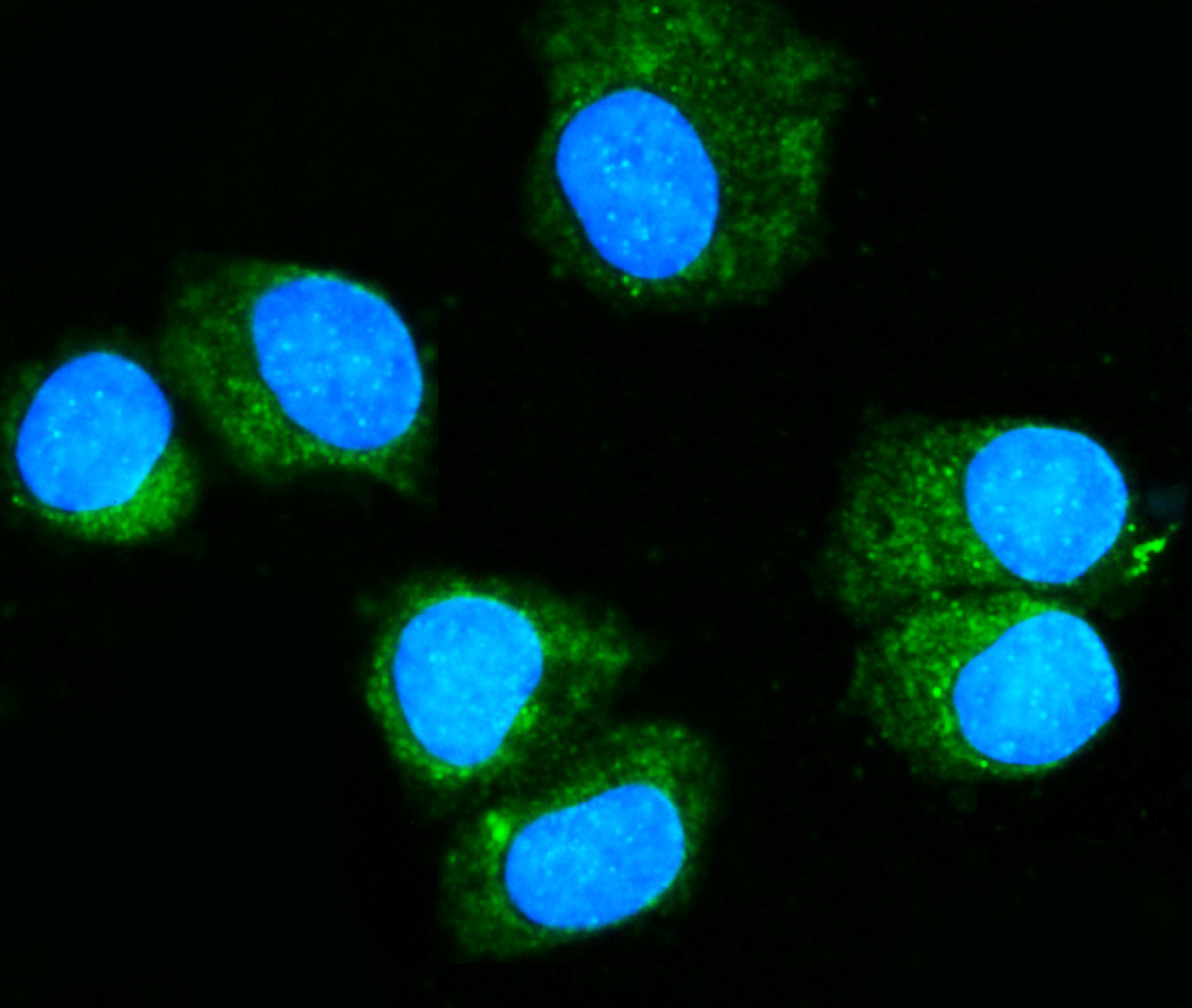 RAB11A was detected in an immunocytochemical section of T-47D cells. The section was incubated with mouse anti-RAB11A Antibody (M01436-2) at a dilution of 1:100. Fluoro488-conjugated Anti-mouse IgG Secondary Antibody (green)(Catalog#BA1126) was used as secondary antibody. The section was counterstained with DAPI (Catalog # AR1176) (Blue).