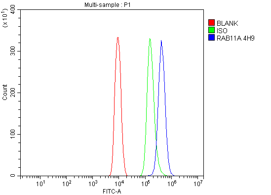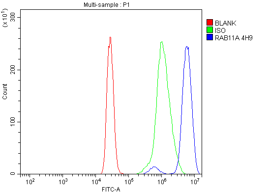 Overlay histogram showing RH-35 cells stained with M01436-2 (Blue line). To facilitate intracellular staining, cells were fixed with 4% paraformaldehyde and permeabilized with permeabilization buffer. The cells were blocked with 10% normal goat serum. And then incubated with mouse anti-RAB11A Antibody (M01436-2) at 1:100 dilution for 30 min at 20°C. Fluoro488 conjugated goat anti-mouse IgG (BA1126) was used as secondary antibody at 1:100 dilution for 30 minutes at 20°C. Isotype control antibody (Green line) was mouse IgG at 1:100 dilution used under the same conditions. Unlabelled sample without incubation with primary antibody and secondary antibody (Red line) was used as a blank control.