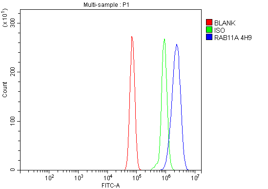 Overlay histogram showing ANA-1 cells stained with M01436-2 (Blue line). To facilitate intracellular staining, cells were fixed with 4% paraformaldehyde and permeabilized with permeabilization buffer. The cells were blocked with 10% normal goat serum. And then incubated with mouse anti-RAB11A Antibody (M01436-2) at 1:100 dilution for 30 min at 20°C. Fluoro488 conjugated goat anti-mouse IgG (BA1126) was used as secondary antibody at 1:100 dilution for 30 minutes at 20°C. Isotype control antibody (Green line) was mouse IgG at 1:100 dilution used under the same conditions. Unlabelled sample without incubation with primary antibody and secondary antibody (Red line) was used as a blank control.