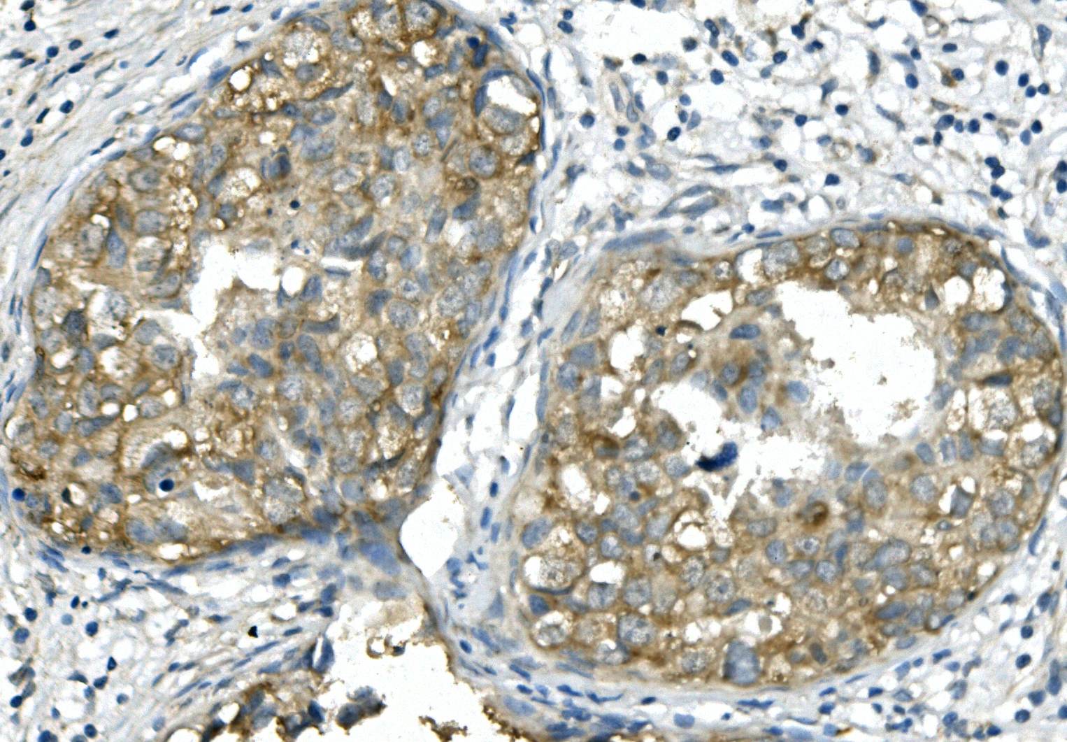 BubR1/BUB1B was detected in a paraffin-embedded section of human mammary cancer tissue. Biotinylated goat anti-mouse IgG was used as secondary antibody. The tissue section was incubated with mouse anti-BubR1/BUB1B Antibody (M01564-3) at a dilution of 1:200 and developed using Strepavidin-Biotin-Complex (SABC) (Catalog # SA1021) with DAB (Catalog # AR1027) as the chromogen.