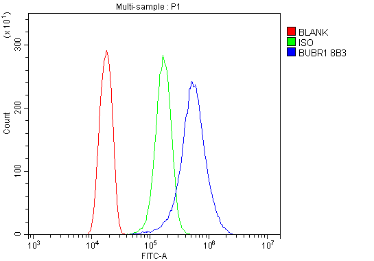 Overlay histogram showing Hela cells stained with M01564-3 (Blue line). To facilitate intracellular staining, cells were fixed with 4% paraformaldehyde and permeabilized with permeabilization buffer. The cells were blocked with 10% normal goat serum. And then incubated with mouse anti-BubR1/BUB1B Antibody (M01564-3) at 1:100 dilution for 30 min at 20°C. Fluoro488 conjugated goat anti-mouse IgG (BA1126) was used as secondary antibody at 1:100 dilution for 30 minutes at 20°C. Isotype control antibody (Green line) was mouse IgG at 1:100 dilution used under the same conditions. Unlabelled sample without incubation with primary antibody and secondary antibody (Red line) was used as a blank control.