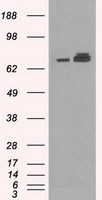 HEK293T cells were transfected with the pCMV6-ENTRY control (Left lane) or pCMV6-ENTRY HSPA9 (Right lane) cDNA for 48 hrs and lysed. Equivalent amounts of cell lysates (5 ug per lane) were separated by SDS-PAGE and immunoblotted with anti-HSPA9(Cat# M02561-1).