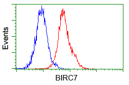 Flow cytometric analysis of Jurkat cells, using anti-BIRC7 antibody, (Red) compared to a nonspecific negative control antibody (Blue).