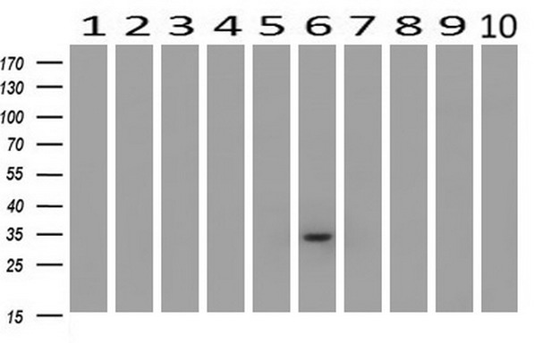 Western blot analysis of extracts (10ug) from 10 Human tissue by using anti-BIRC7 monoclonal antibody at 1:200 (1: Testis; 2: Omentum; 3: Uterus; 4: Breast; 5: Brain; 6: Liver; 7: Ovary; 8: Thyroid gland; 9: colon;10: spleen).