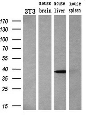 Western blot analysis of extracts (10ug) from a mouse cell line and 3 different mouse tissues by using anti-BIRC7 monoclonal antibody (1:200).