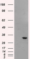 HEK293T cells were transfected with the pCMV6-ENTRY control (Left lane) or pCMV6-ENTRY BIRC7 (Right lane) cDNA for 48 hrs and lysed. Equivalent amounts of cell lysates (5 ug per lane) were separated by SDS-PAGE and immunoblotted with anti-BIRC7(Cat# M02577).