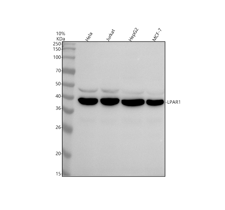 HEK293T cells were transfected with the pCMV6-ENTRY control (Left lane) or pCMV6-ENTRY LPAR1 (Right lane) cDNA for 48 hrs and lysed. Equivalent amounts of cell lysates (5 ug per lane) were separated by SDS-PAGE and immunoblotted with anti-LPAR1(Cat# M02782-1).