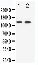 After electrophoresis, proteins were transferred to a membrane. Then the membrane was incubated with rabbit anti-EPHB3 antigen affinity purified monoclonal antibody (M04659-1) at a dilution of 1:1000 and probed with a goat anti-rabbit IgG-HRP secondary antibody (Catalog # BA1054). The signal is developed using ECL Plus Western Blotting Substrate (Catalog # AR1197). A specific band was detected for EPHB3 at approximately 110 kDa. The expected band size for EPHB3 is at 110 kDa.