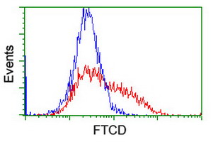 HEK293T cells transfected with either overexpress plasmid (Red) or empty vector control plasmid (Blue) were immunostained by anti-FTCD antibody, and then analyzed by flow cytometry.
