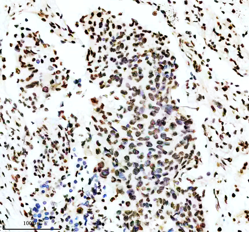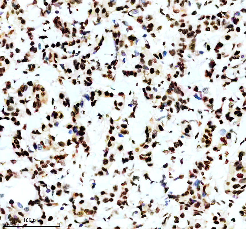P-MDM2 was detected in a paraffin-embedded section of human lung cancer tissue. The tissue section was incubated with rabbit anti-P-MDM2 Antibody (P00054-2) at a dilution of 1:200 and developed using HRP Conjugated Rabbit IgG Super Vision Assay Kit (Catalog # SV0002) with DAB (Catalog # AR1027) as the chromogen.