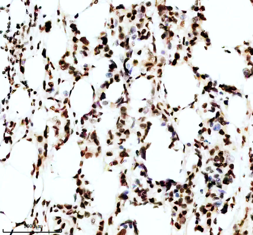 P-MDM2 was detected in a paraffin-embedded section of human breast cancer tissue. The tissue section was incubated with rabbit anti-P-MDM2 Antibody (P00054-2) at a dilution of 1:200 and developed using HRP Conjugated Rabbit IgG Super Vision Assay Kit (Catalog # SV0002) with DAB (Catalog # AR1027) as the chromogen.