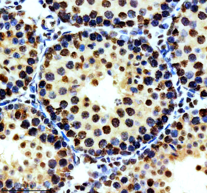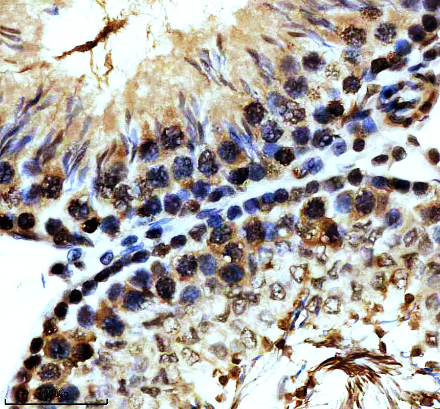 P-MDM2 was detected in a paraffin-embedded section of rat testis tissue. The tissue section was incubated with rabbit anti-P-MDM2 Antibody (P00054-2) at a dilution of 1:200 and developed using HRP Conjugated Rabbit IgG Super Vision Assay Kit (Catalog # SV0002) with DAB (Catalog # AR1027) as the chromogen.