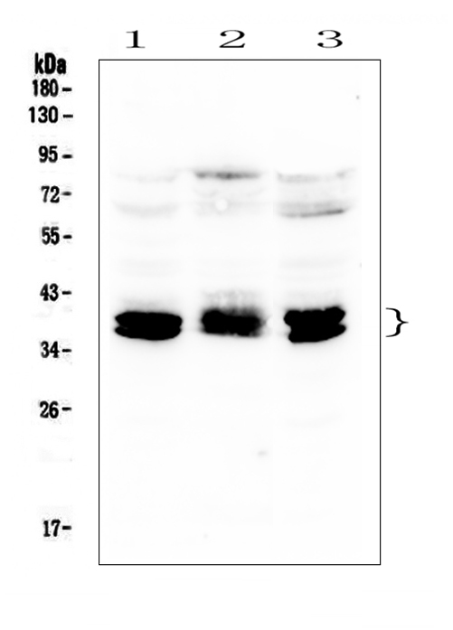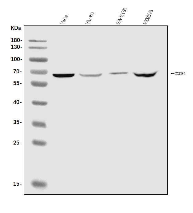 Western blot analysis of CXCR4 using anti-CXCR4 antibody (PA1237). The sample well of each lane was loaded with 30 ug of sample under reducing conditions.