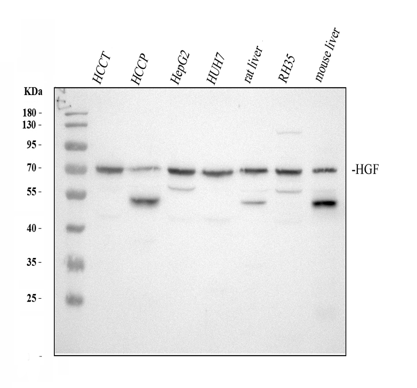 Western blot analysis of HGF using anti-HGF antibody (PB0298). The sample well of each lane was loaded with 30 ug of sample under reducing conditions.