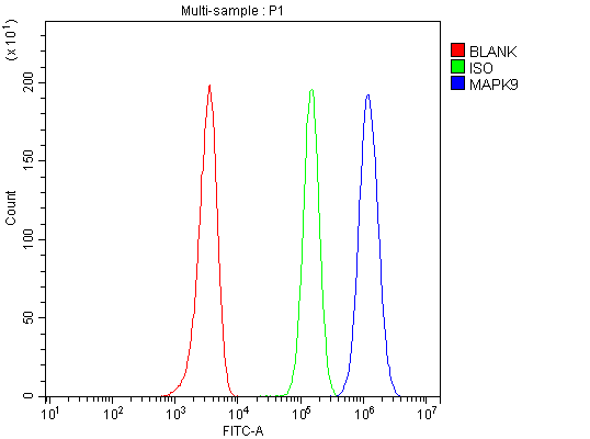 Overlay histogram showing RH-35 cells stained with PB0522 (Blue line). To facilitate intrMyelin basic protein/MBPllular staining, cells were fixed with 4% paraformaldehyde and permeabilized with permeabilization buffer. The cells were blocked with 10% normal goat serum. And then incubated with rabbit anti-JNK2/MAPK9 Antibody (PB0522) at 1:100 dilution for 30 min at 20°C. Fluoro488 conjugated goat anti-rabbit IgG (BA1127) was used as secondary antibody at 1:100 dilution for 30 minutes at 20°C. Isotype control antibody (Green line) was rabbit IgG at 1:100 dilution used under the same conditions. Unlabelled sample without incubation with primary antibody and secondary antibody (Red line) was used as a blank control.