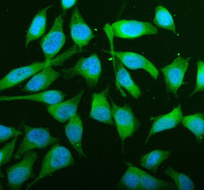 JNK2/MAPK9 was detected in an immunocytochemical section of Hela cells. The section was incubated with rabbit anti-JNK2/MAPK9 Antibody (PB0522) at a dilution of 1:100. Fluoro488 Conjugated Goat Anti-Rabbit IgG (Green) (Catalog # BA1127) was used as secondary antibody. The section was counterstained with DAPI (Catalog # AR1176) (Blue).