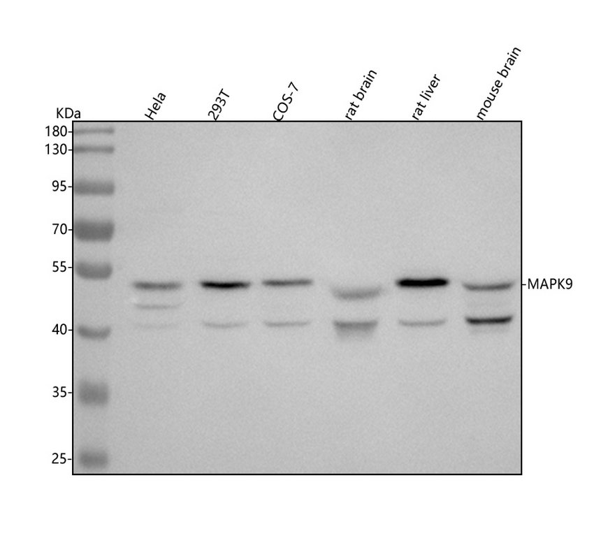 Western blot analysis of JNK2/MAPK9 using anti-JNK2/MAPK9 antibody (PB0522). The sample well of each lane was loaded with 30 ug of sample under reducing conditions.