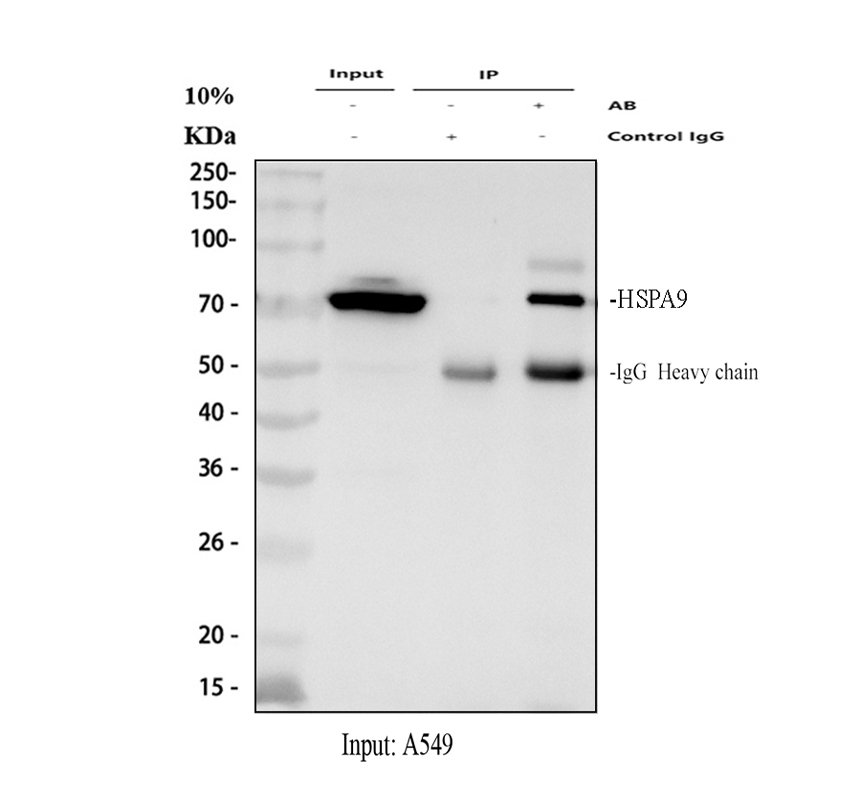IP analysis of GRP75/HSPA9 using anti-GRP75/HSPA9 antibody (PB0668) in A549 whole cell lysate.