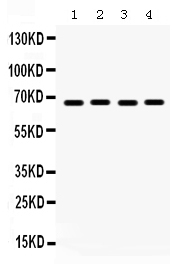 After electrophoresis, proteins were transferred to a membrane. Then the membrane was incubated with rabbit anti-ETV4 antigen affinity purified polyclonal antibody (PB0778) at a dilution of 1:1000 and probed with a goat anti-rabbit IgG-HRP secondary antibody (Catalog # BA1054). The signal is developed using ECL Plus Western Blotting Substrate (Catalog # AR1197). A specific band was detected for ETV4 at approximately 68 kDa. The expected band size for ETV4 is at 54 kDa.