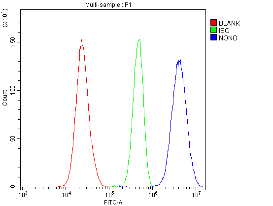Overlay histogram showing Hela cells stained with PB0922 (Blue line). To facilitate intracellular staining, cells were fixed with 4% paraformaldehyde and permeabilized with permeabilization buffer. The cells were blocked with 10% normal goat serum. And then incubated with rabbit anti-NONO Antibody (PB0922) at 1:100 dilution for 30 min at 20°C. Fluoro488 conjugated goat anti-rabbit IgG (BA1127) was used as secondary antibody at 1:100 dilution for 30 minutes at 20°C. Isotype control antibody (Green line) was rabbit IgG at 1:100 dilution used under the same conditions. Unlabelled sample without incubation with primary antibody and secondary antibody (Red line) was used as a blank control.