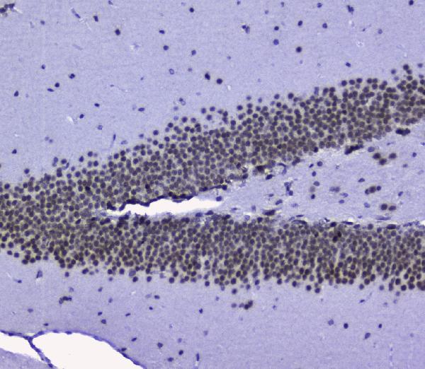 NONO was detected in a paraffin-embedded section of mouse brain tissue. The tissue section was developed using HRP Conjugated Rabbit IgG Super Vision Assay Kit (Catalog # SV0002) with DAB (Catalog # AR1027) as the chromogen.