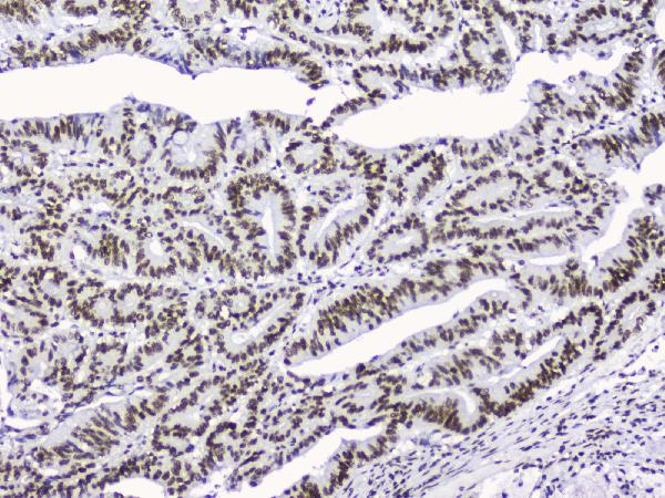 NONO was detected in a paraffin-embedded section of human intestinal cancer tissue. The tissue section was developed using HRP Conjugated Rabbit IgG Super Vision Assay Kit (Catalog # SV0002) with DAB (Catalog # AR1027) as the chromogen.