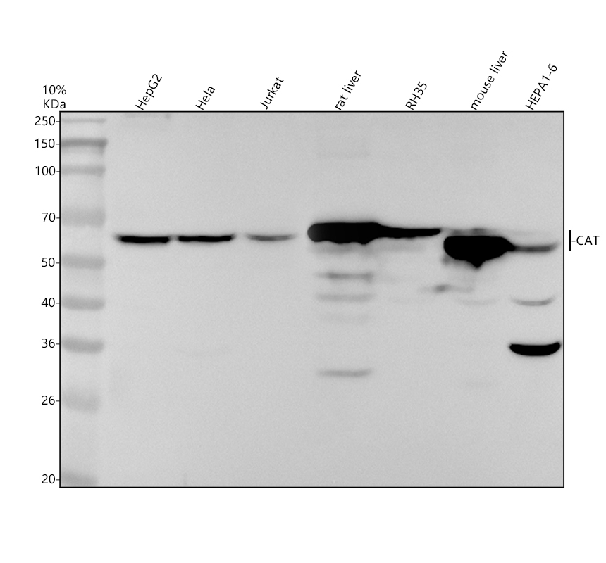 Western blot analysis of Catalase/CAT using anti-Catalase/CAT antibody (PB0971). The sample well of each lane was loaded with 30 ug of sample under reducing conditions.