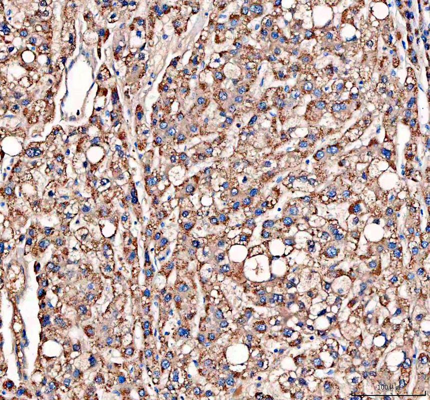 Catalase/CAT was detected in a paraffin-embedded section of human liver cancer tissue. The tissue section was incubated with rabbit anti-Catalase/CAT Antibody (PB0971) at a dilution of 1:200 and developed using HRP Conjugated Rabbit IgG Super Vision Assay Kit (Catalog # SV0002) with DAB (Catalog # AR1027) as the chromogen.