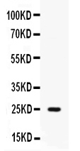 After electrophoresis, proteins were transferred to a membrane. Then the membrane was incubated with rabbit anti-Elafin/Skalp/PI3 antigen affinity purified polyclonal antibody (PB0985) at a dilution of 1:1000 and probed with a goat anti-rabbit IgG-HRP secondary antibody (Catalog # BA1054). The signal is developed using ECL Plus Western Blotting Substrate (Catalog # AR1197). A specific band was detected for Elafin/Skalp/PI3 at approximately 25 kDa. The expected band size for Elafin/Skalp/PI3 is at 12 kDa.