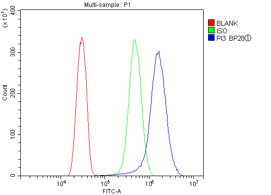 Overlay histogram showing SiHa cells stained with PB0985 (Blue line). The cells were fixed with 4% paraformaldehyde and blocked with 10% normal goat serum. And then incubated with rabbit anti-Elafin/Skalp/PI3 Antibody (PB0985) at 1:100 dilution for 30 min at 20°C. Fluoro488 conjugated goat anti-rabbit IgG (BA1127) was used as secondary antibody at 1:100 dilution for 30 minutes at 20°C. Isotype control antibody (Green line) was rabbit IgG at 1:100 dilution used under the same conditions. Unlabelled sample without incubation with primary antibody and secondary antibody (Red line) was used as a blank control.