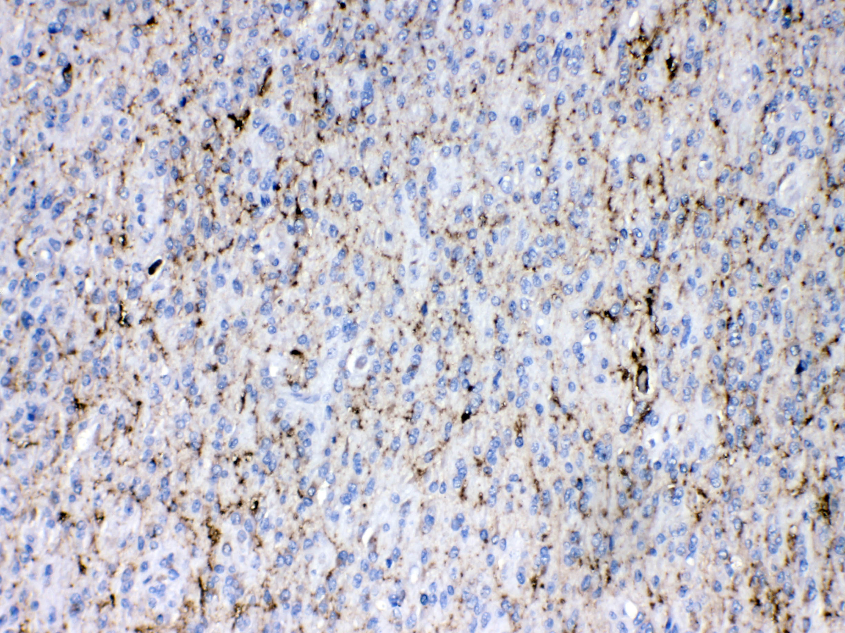 SYN1 was detected in a paraffin-embedded section of human glioma tissue. Biotinylated goat anti-rabbit IgG was used as secondary antibody. The tissue section was incubated with rabbit anti-SYN1 Antibody (PB10099) at a dilution of 1:200 and developed using Strepavidin-Biotin-Complex (SABC) (Catalog # SA1022) with DAB (Catalog # AR1027) as the chromogen.