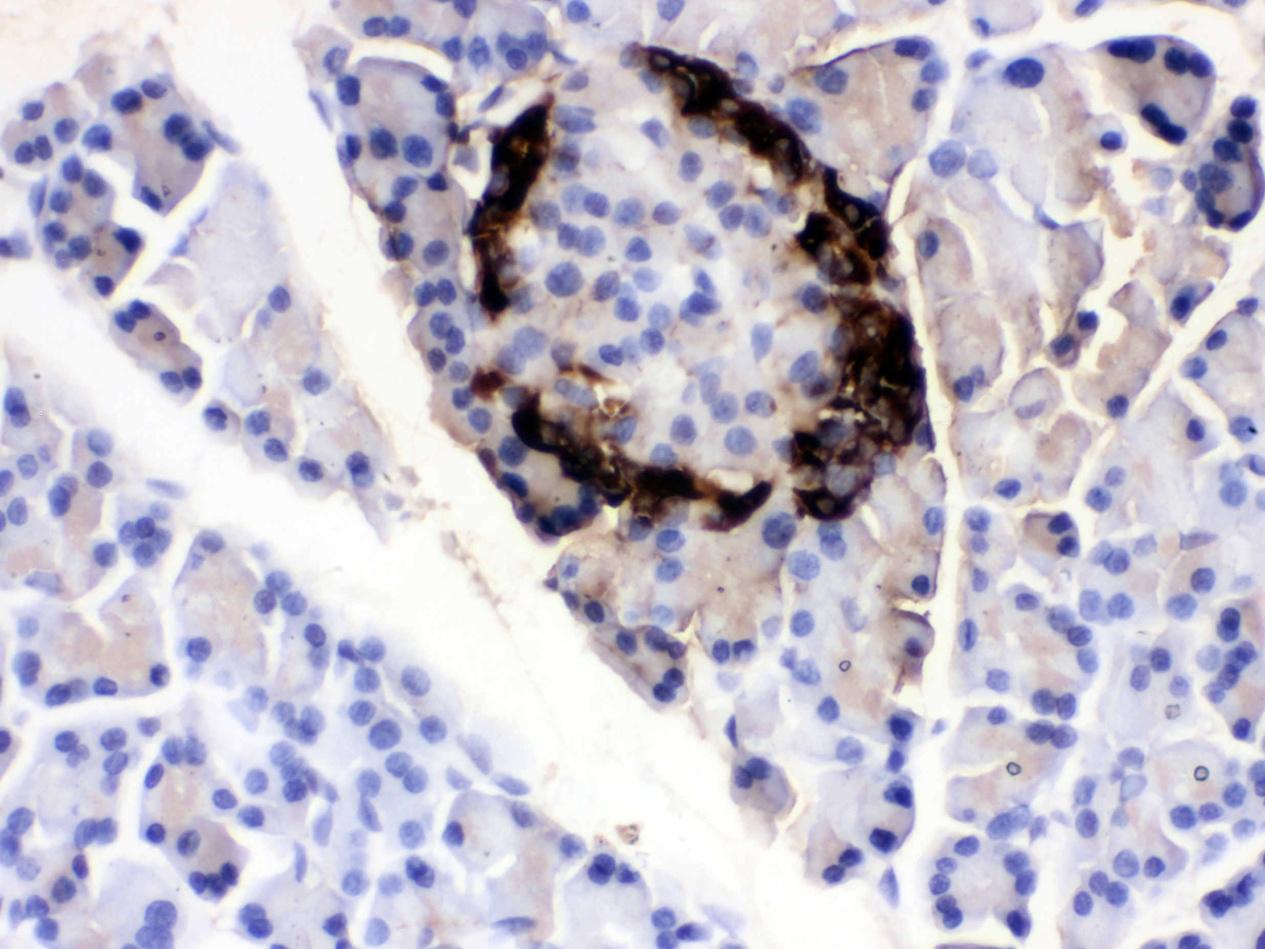 VIP was detected in a paraffin-embedded section of rat pancreas tissue. Biotinylated goat anti-rabbit IgG was used as secondary antibody. The tissue section was incubated with rabbit anti-VIP Antibody (PB1017) at a dilution of 1:200 and developed using Strepavidin-Biotin-Complex (SABC) (Catalog # SA1022) with DAB (Catalog # AR1027) as the chromogen.