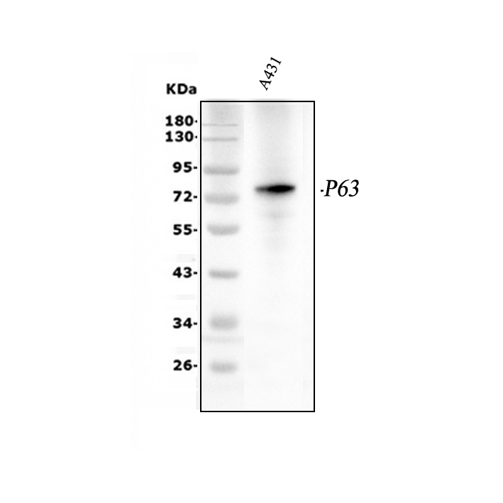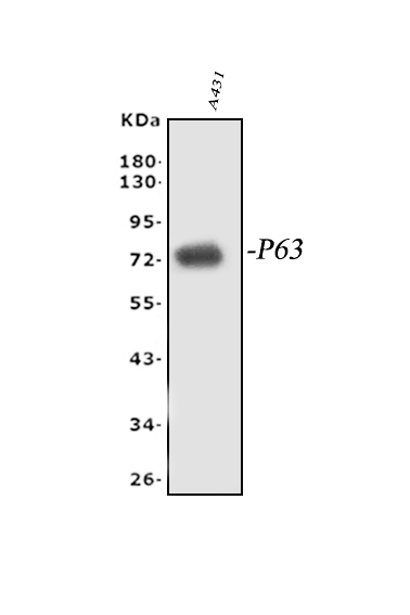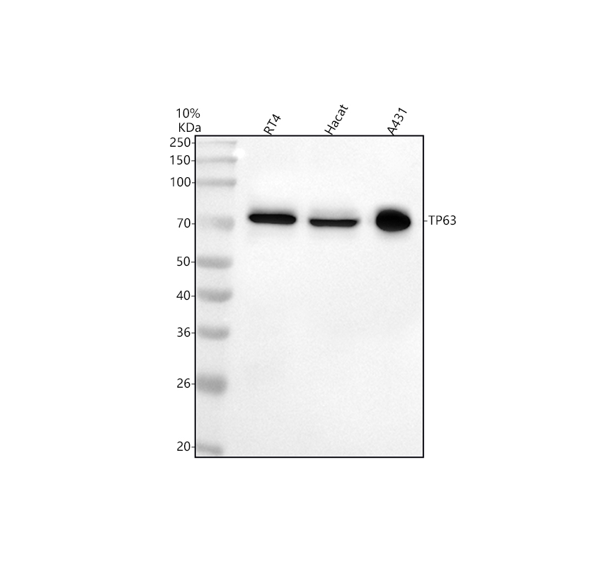 Western blot analysis of p63/TP63 using anti-p63/TP63 antibody (PB9152). The sample well of each lane was loaded with 30 ug of sample under reducing conditions.