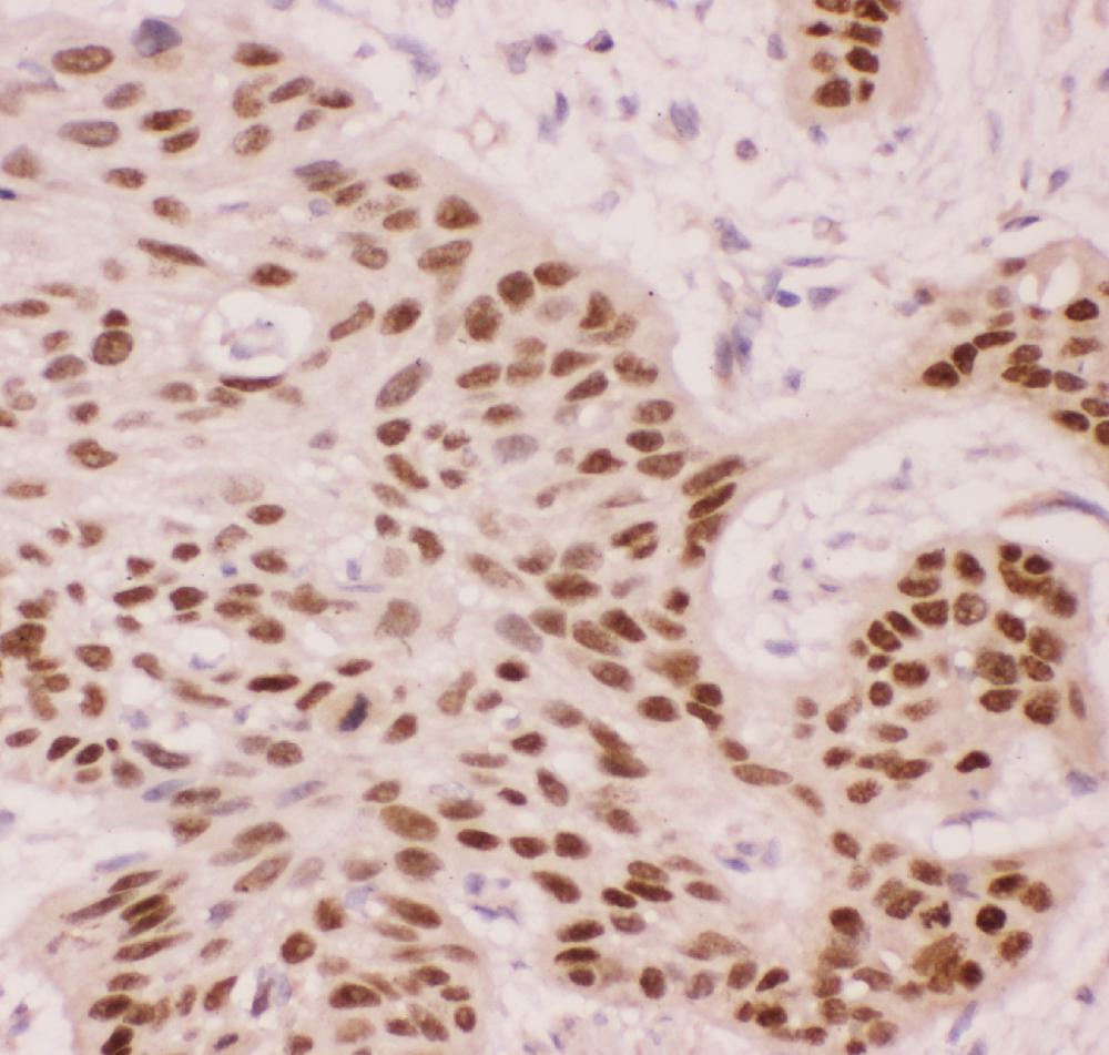 p63/TP63 was detected in a paraffin-embedded section of human oesophagus squama cancer tissue. Biotinylated goat anti-rabbit IgG was used as secondary antibody. The tissue section was incubated with rabbit anti-p63/TP63 Antibody (PB9152) at a dilution of 1:200 and developed using Strepavidin-Biotin-Complex (SABC) (Catalog # SA1022) with DAB (Catalog # AR1027) as the chromogen.