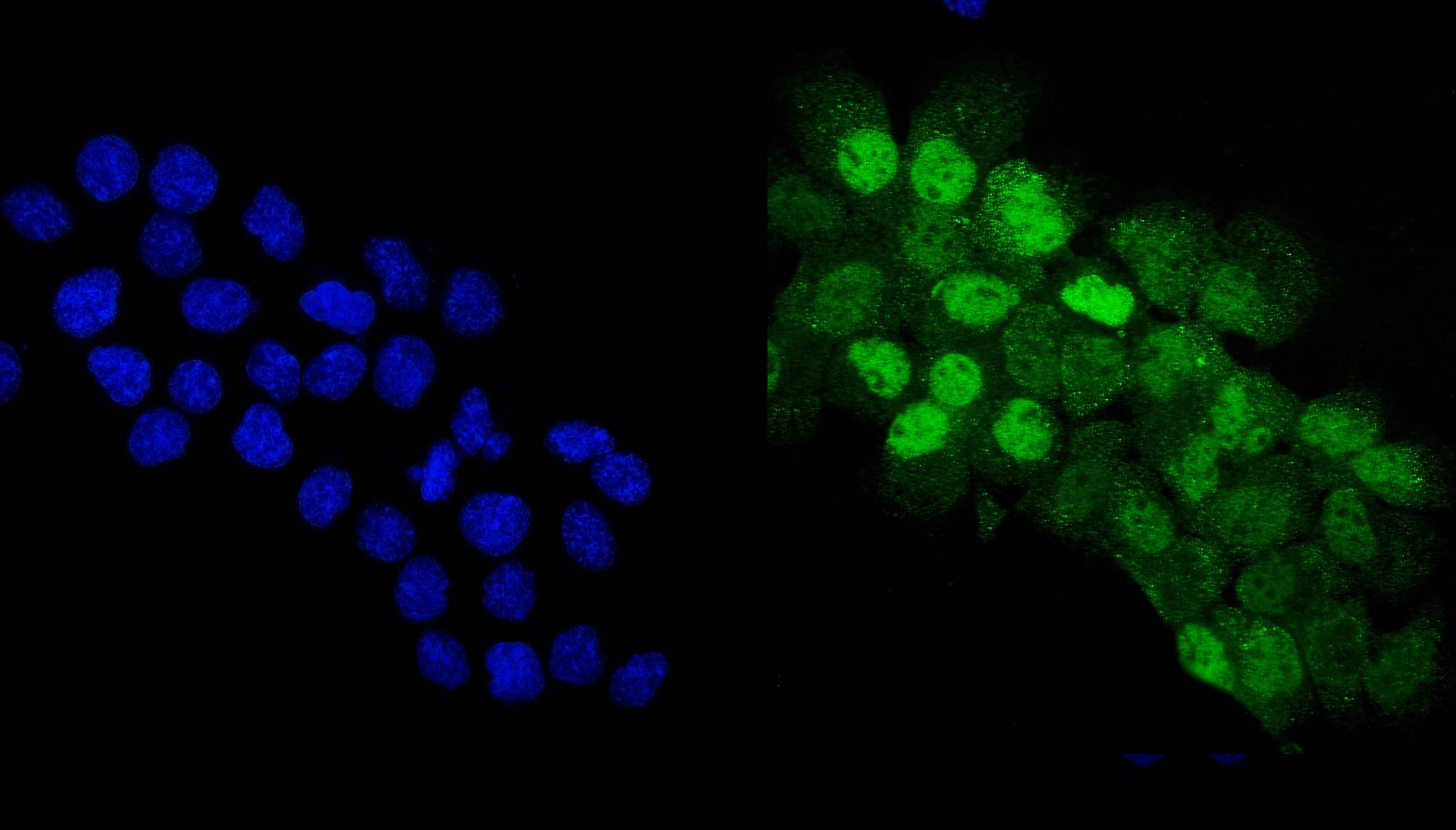 p63/TP63 was detected in an immunocytochemical section of A431 cells. The section was incubated with rabbit anti-p63/TP63 Antibody (PB9152) at a dilution of 1:100. Fluoro488 Conjugated Goat Anti-Rabbit IgG (Green) (Catalog # BA1127) was used as secondary antibody. The section was counterstained with DAPI (Catalog # AR1176) (Blue).