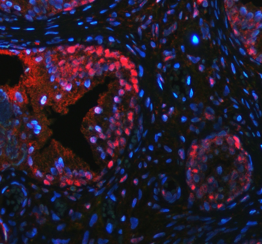 p63/TP63 was detected in a paraffin-embedded section of human prostate hyperplasia tissue. The tissue section was incubated with rabbit anti-p63/TP63 Antibody (PB9152) at a dilution of 1:100. Cy3-conjugated Anti-rabbit IgG Secondary Antibody (red) (Catalog # BA1032) was used as secondary antibody. The section was counterstained with DAPI (Catalog # AR1176) (Blue).