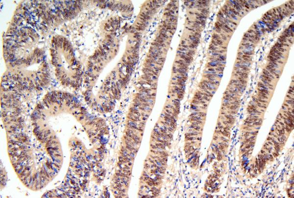 HNF4A was detected in a paraffin-embedded section of human intestinal cancer tissue. The tissue section was incubated with rabbit anti-HNF4A Antibody (PB9215) at a dilution of 1:200 and developed using HRP Conjugated Rabbit IgG Super Vision Assay Kit (Catalog # SV0002) with DAB (Catalog # AR1027) as the chromogen.