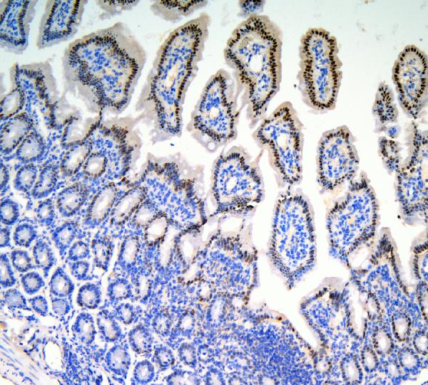 HNF4A was detected in a paraffin-embedded section of mouse intestine tissue. The tissue section was incubated with rabbit anti-HNF4A Antibody (PB9215) at a dilution of 1:200 and developed using HRP Conjugated Rabbit IgG Super Vision Assay Kit (Catalog # SV0002) with DAB (Catalog # AR1027) as the chromogen.