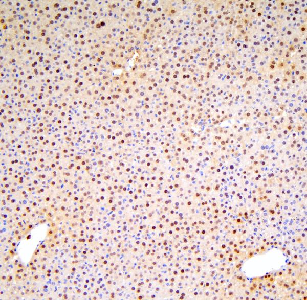 HNF4A was detected in a paraffin-embedded section of rat liver tissue. The tissue section was incubated with rabbit anti-HNF4A Antibody (PB9215) at a dilution of 1:200 and developed using HRP Conjugated Rabbit IgG Super Vision Assay Kit (Catalog # SV0002) with DAB (Catalog # AR1027) as the chromogen.
