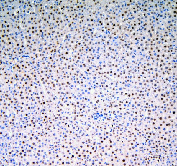 HNF4A was detected in a paraffin-embedded section of mouse liver tissue. The tissue section was incubated with rabbit anti-HNF4A Antibody (PB9215) at a dilution of 1:200 and developed using HRP Conjugated Rabbit IgG Super Vision Assay Kit (Catalog # SV0002) with DAB (Catalog # AR1027) as the chromogen.